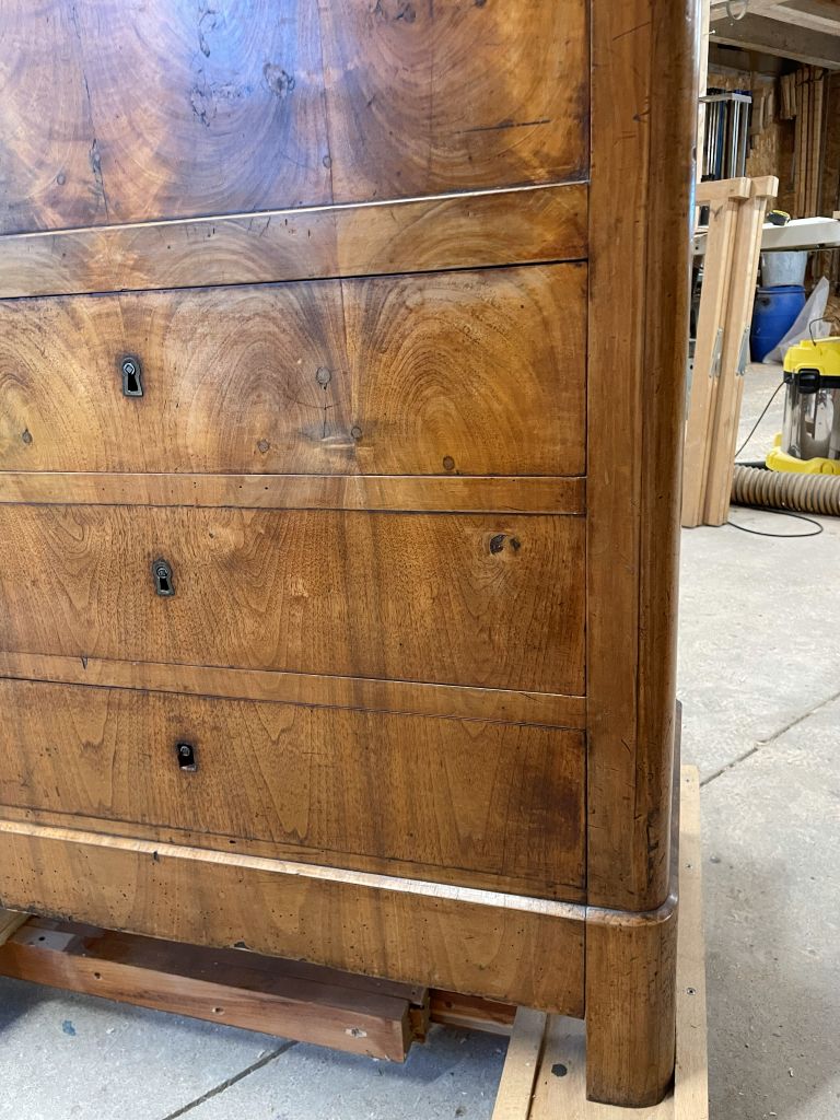 Commode après restauration, placage du plateau avec de l'acajou flammé, vernissage tampon
